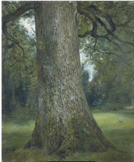 The elm – murderous maybe, keeper of the underworld – quite possibly, waiting for a woman to subsume or to drop branches on man … such thoughts never crossed the artist, John Constable’s mind, a great capturer of elms. When you look at John Constable’s paintings with its dark smudges and daubs of verdant browns, it’s hard to imagine such barbarous acts; but take a minute to look at his famous painting Study of the Trunk of an Elm Tree. It’s photographic. Its stillness promises something expectant – like a fatal bough might fall, a faerie might playfully hopscotch among its roots, or Charon the ferryman of Hades might emerge … or perhaps a strong woman with plenty to say. Either way, Constable was delighted by them; his good friend C.R. Leslie commenting ‘I have seen him admire a fine tree with an ecstasy of delight like that with which he would catch up a beautiful child in his arms’.